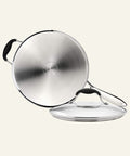 • GLASS LID & MULTIPLE COOKTOPS: Shatterproof clear glass lid with heat proof handle. Lets you see through while cooking. Heat proof helper handle. Works on multiple cooktops. Induction, gas, electric, halogen etc. The best induction pan.